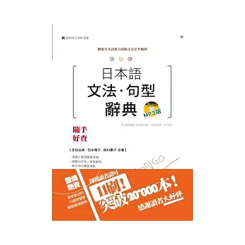 感謝大家的支持!《日本語文法.句型辭典》自出版以來,廣眾受到各位讀者們的極度好評!為了回饋讀者,《日本語文法.句型辭典》終於推出MP3版了!MP3中收錄書中的所有日文例句,MP3配合一書,即可一次幫助您攻破日本語的「聽,說,讀,寫」四大層面。